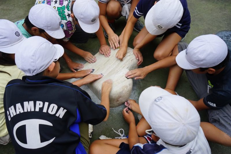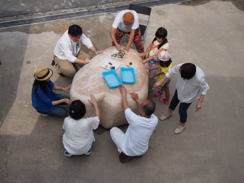 巨大な小松石から彫刻された「Love Stone」を、みんなで磨き完成させるワークショップ。やすりの粗さを細かく変えながら皆さんと小松石のハートを磨いていきます。 ※ 荒天の場合は中止